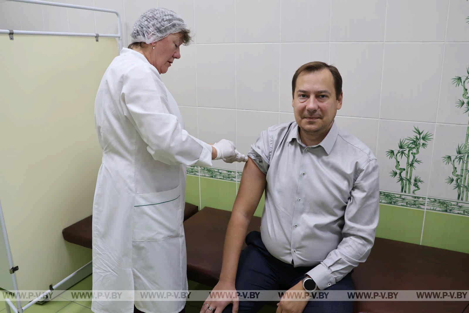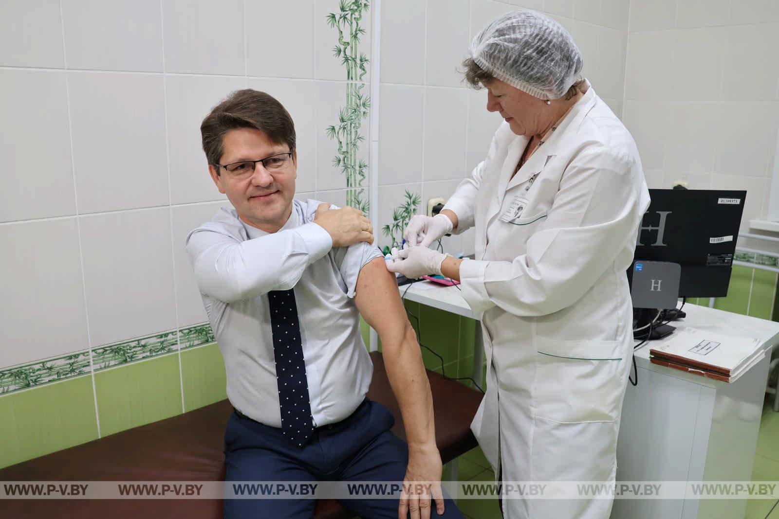 Главный врач центральной поликлиники Игорь Киктенко и главный государственный санитарный врач г. Пинска и Пинского района Борис Кухарчук сделали прививки против гриппа вакциной российского производства «Гриппол плюс».