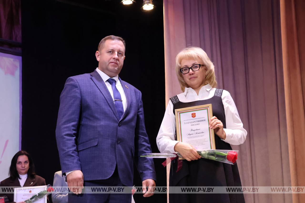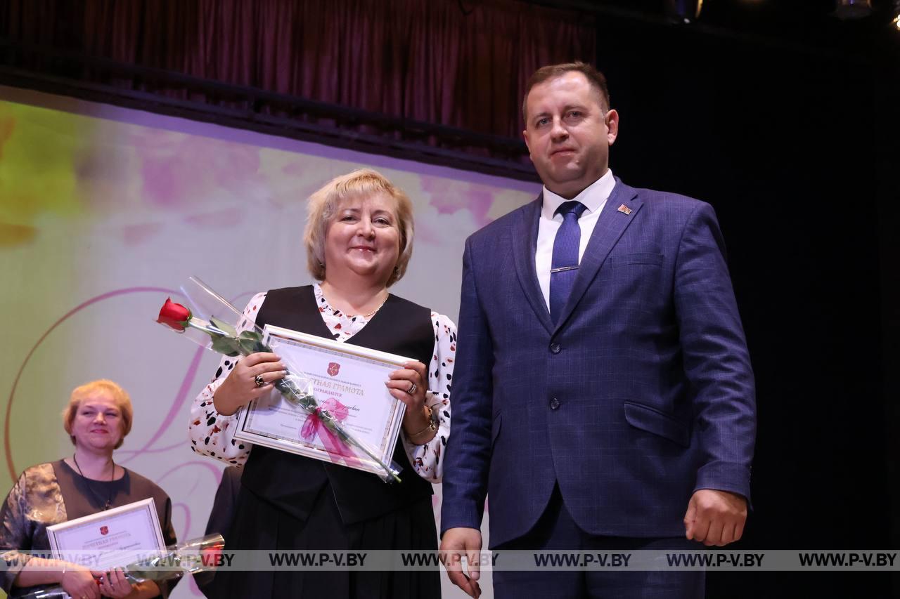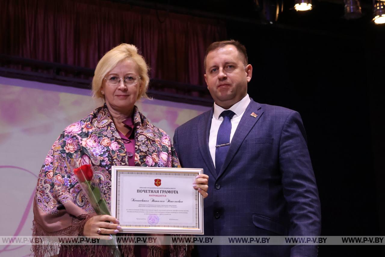 Центральным моментом вечера стало награждение. Десятки педагогов из разных учебных заведений Пинска поднялись на сцену, чтобы получить грамоты, благодарности и другие знаки отличия за свой труд.