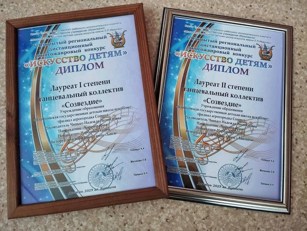 За участие в V Открытом региональном дистанционном многожанровом конкурсе «Искусство детям» награждены танцевальный коллектив «Созвездие» – дипломом лауреата I и II степени в номинации «Народный танец»; учащийся Станислав Васерук – дипломом лауреата III степени в номинации «Инструментальное исполнительство».