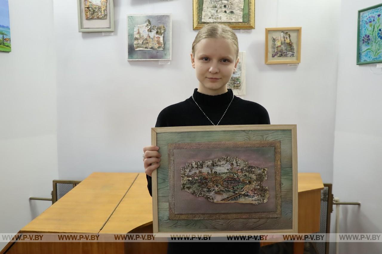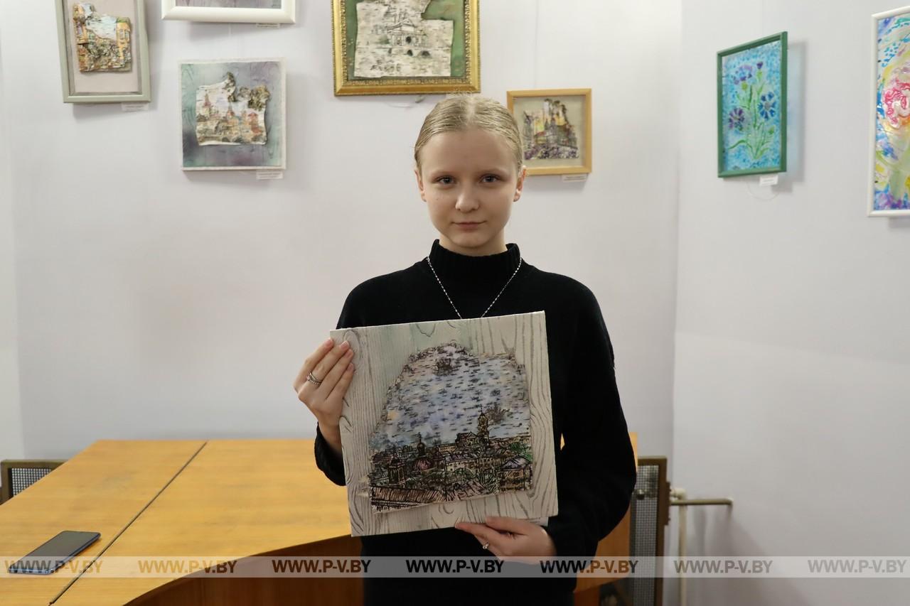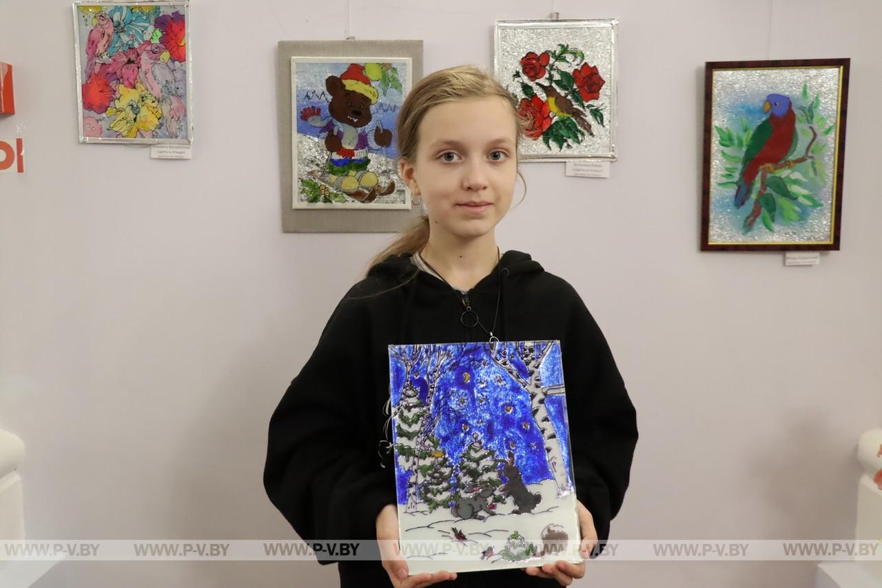 Ученица выпускного класса средней школы № 16 Стефания Лодыга посещает творческую мастерскую десять лет. Пишет картины на стекле, холстах. Недавно освоила бересту.
