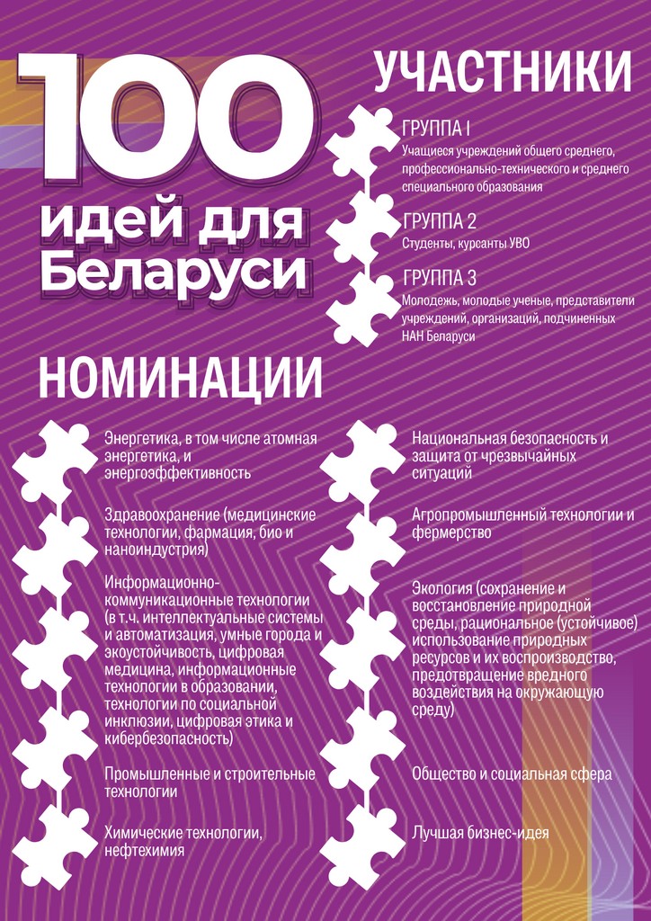 Республиканский молодёжный проект «100 идей для Беларуси» реализуется ОО «БРСМ» при поддержке заинтересованных в целях активизации инновационного мышления молодежи, привлечения ее к решению задач социально-экономического развития Беларуси, поддержки одаренной и талантливой молодежи, а также стимулировании и помощи в продвижении перспективных инновационных разработок.