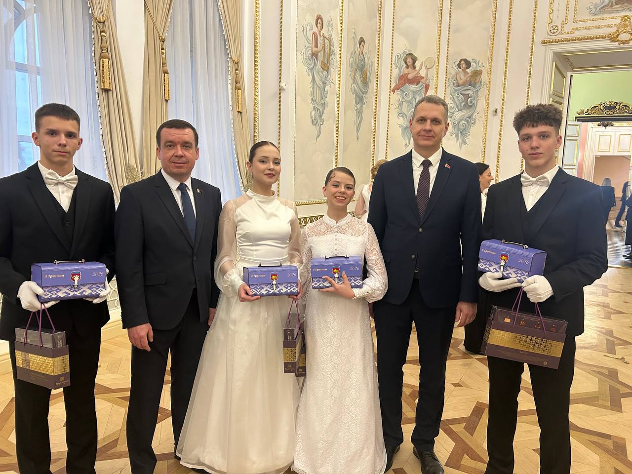 Одаренные юноши и девушки Брестской области, среди них пинчане — учащиеся средней школы №10 Нелли Кузьмич, Максим Платановский, Александр Наконечный, Мария Щур в вечерних нарядах и строгих костюмах танцевали вальс, польку и полночную кадриль в Белом зале Коссовского дворца.