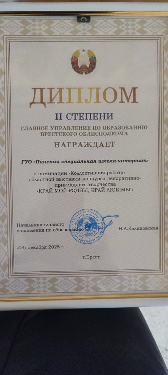 Предновогодние дни для учащихся Пинской специальной школы-интерната запомнились не только яркими радостными моментами республиканской благотворительной акции «Наши дети», но и успешным участием в областной выставке-конкурсе декоративно-прикладного творчества «Край мой родны, край любiмы!», который прошел в Бресте. Работа «Край мой, вышитый лентой» творческого коллектива школы награжден дипломом II степени. Торжественное награждение состоялось в УО «Брестский государственный областной центр молодежного творчества».