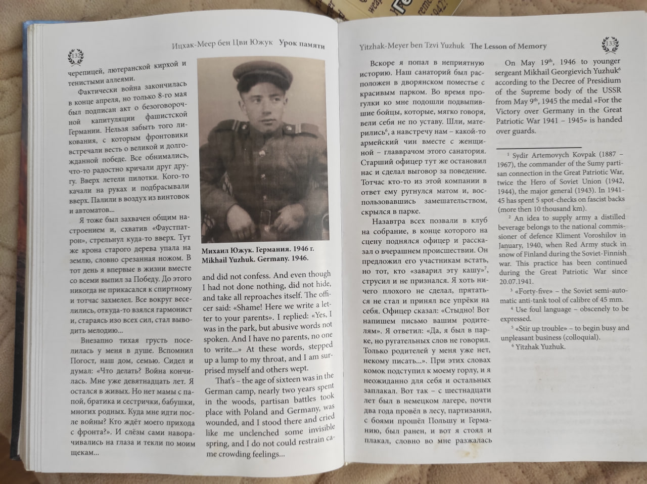 Его полное имя Ицхак-Меер бен Цви Южук. Но здесь, на пинском Полесье, все зовут его дядей Мишей. Такое имя дал юному автоматчику ротный старшина, которому было непривычно имя «Ицхак», и с этим именем прошла армейская служба и послевоенная жизнь в Пинске. А до этого было счастливое детство в дружной семье и озорная юность в родном Погосте, прерванная войной…