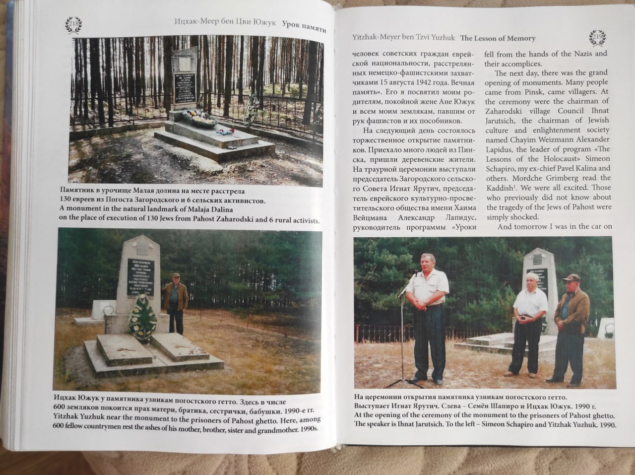«И вы стали для меня семьей» – так всегда говорит Ицхак Гершевич о тех, кто традиционно собирается в Погосте-Загородском, чтобы почтить память сотен погибших от рук фашистов жителей местечка еврейской национальности. Это представители Пинской еврейской общины, Загородского сельисполкома, горожане и сельчане, с кем встретился и подружился Михаил Южук во время поисков, установки памятников, написания своих книг.