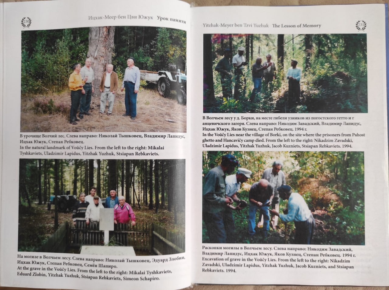 Одна из могил находится возле бывшего еврейского кладбища за деревней Камень. Теперь здесь шумит сосновая лесопосадка. Под сенью деревьев покоятся 130 евреев-мужчин и шесть советских активистов, расстрелянных гитлеровцами 10 августа 1941 года. Среди них отец Михаила – Гирш Южук. Подобные смертельные акции по уничтожению взрослых мужчин и мальчиков от четырнадцати лет нацисты учиняли, чтобы предотвратить сопротивление людей на оккупированной территории. «Никто не видел, как погиб весь цвет еврейской общины Погоста, никто не слышал их предсмертных слов…» – пишет Ицхак Южук в своей книге «Урок памяти».