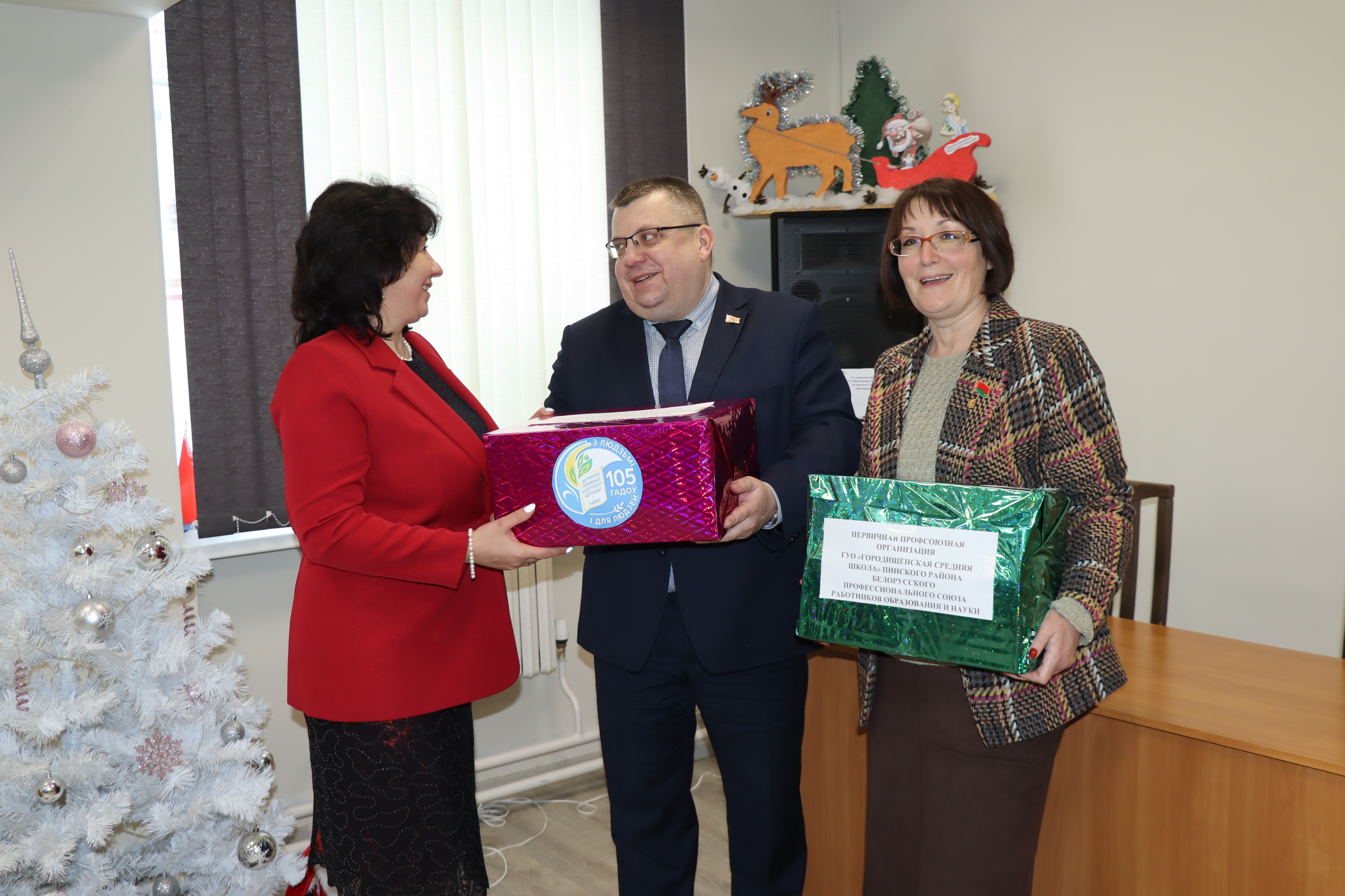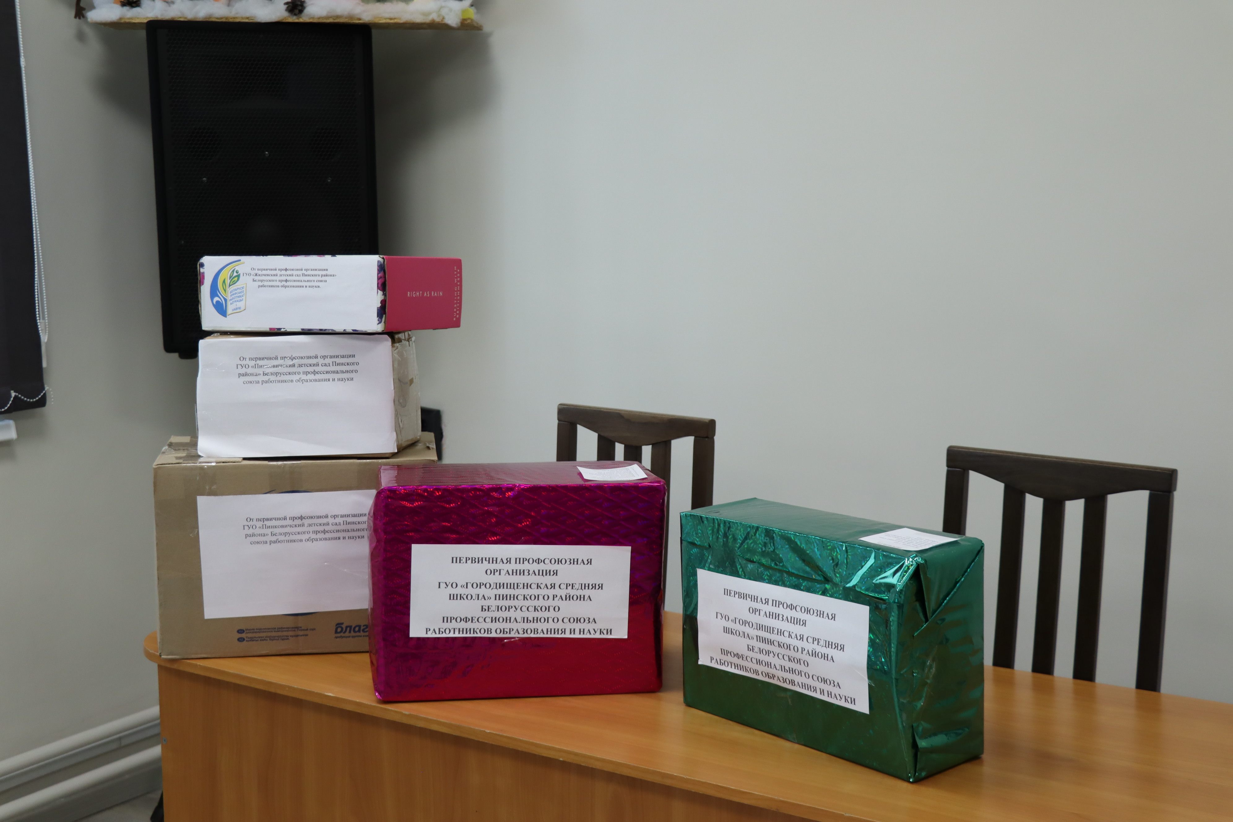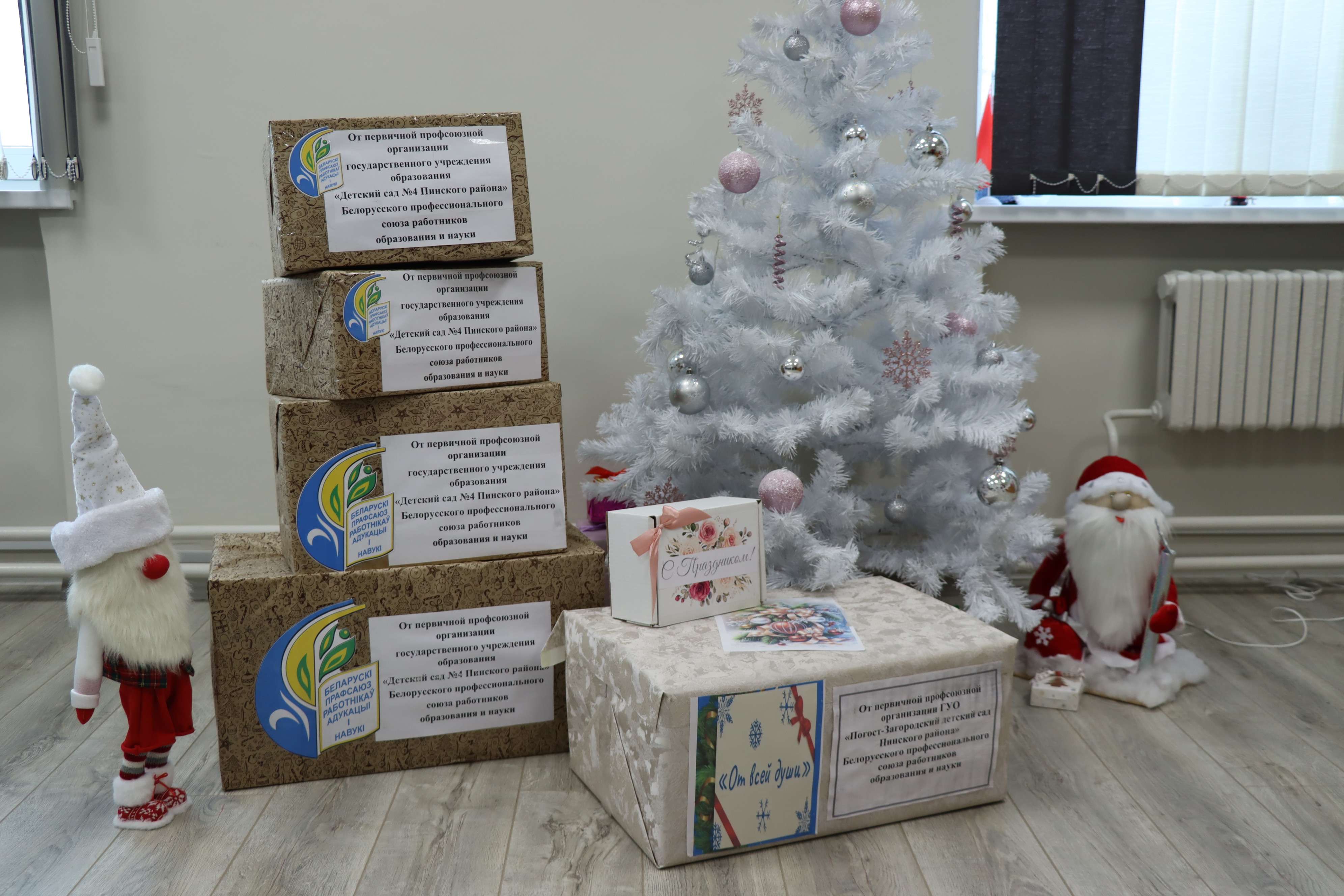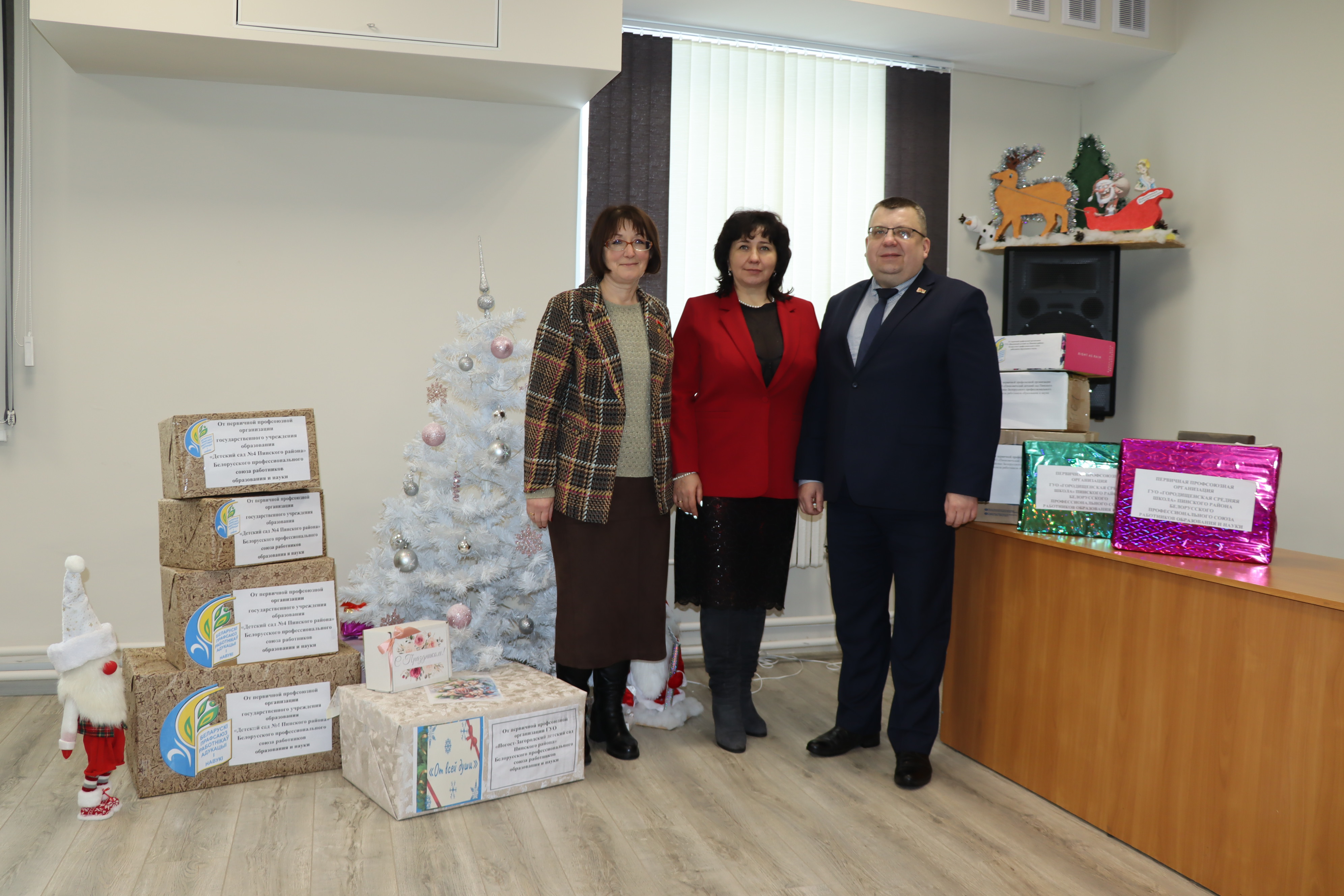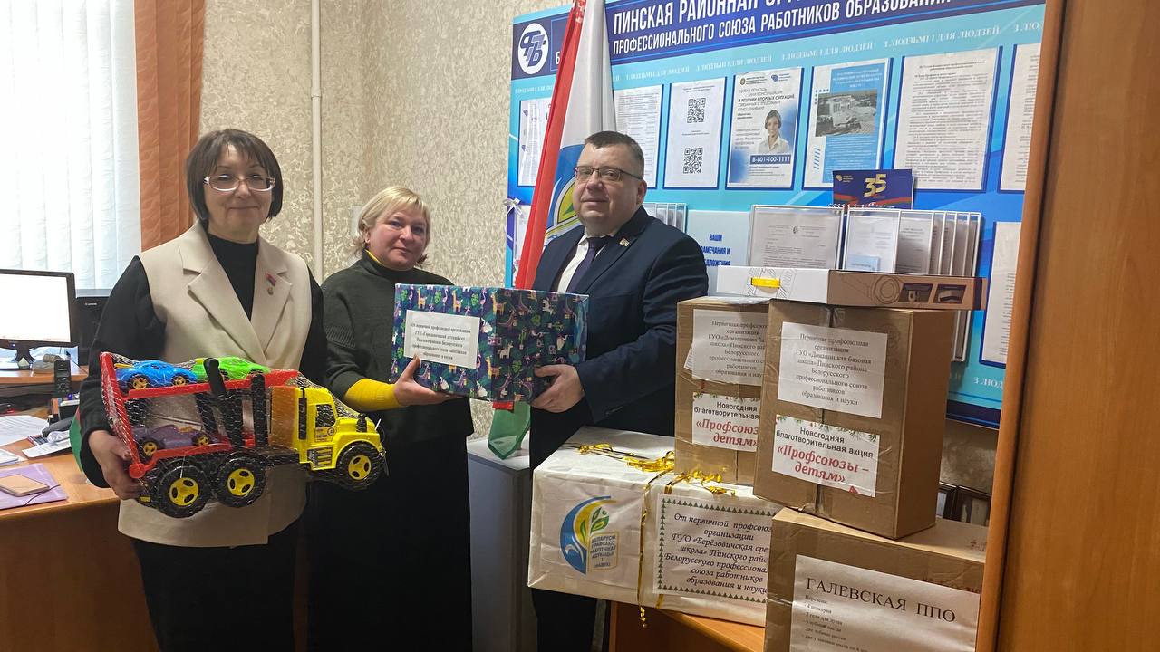 Члены профсоюза Березовичского, Городищенского, Купятичского, Логишинского, Сошненского детских садов, детского сада № 3 Пинского района, Березовичской, Стытычевской средних школ, Домашицкой и Озаричской базовых, Галевской начальной школы организовали сбор подарков для ребят центра коррекционно-развивающего обучения и реабилитации Пинского района и социально-педагогического центра; Молотковичской средней школы и Пинковичского детского сада – для филиала «Специализированный дом ребенка» УЗ «Пинская детская больница»; Лыщенской средней школы и Парохонского детского сада – для домов семейного типа.