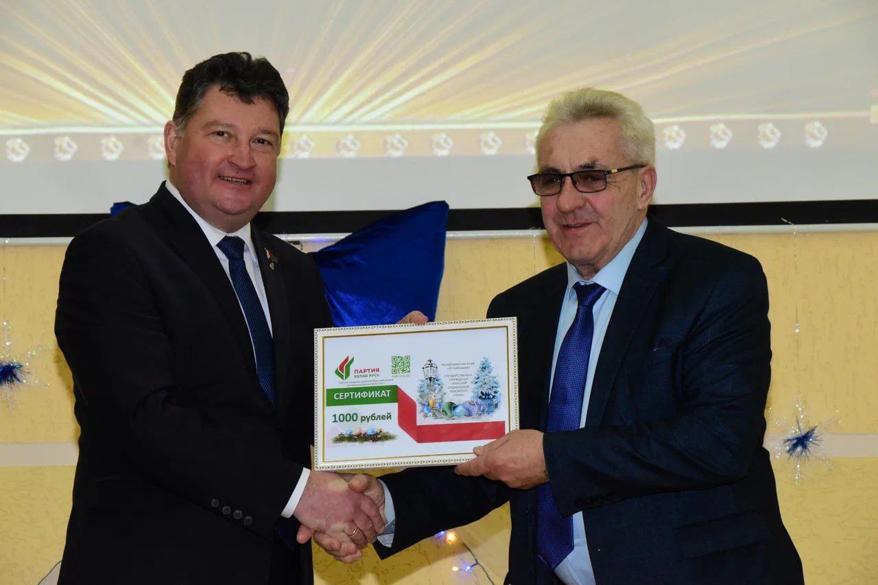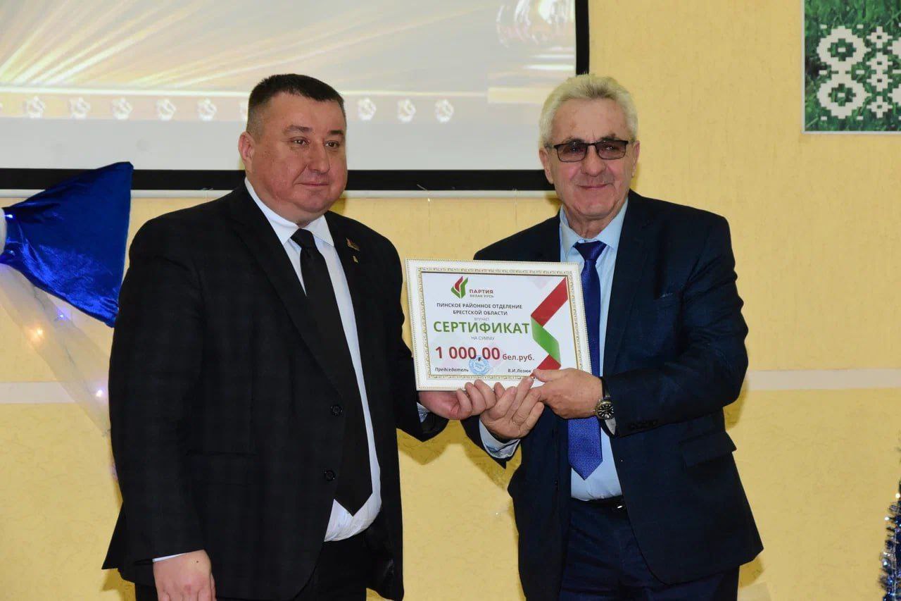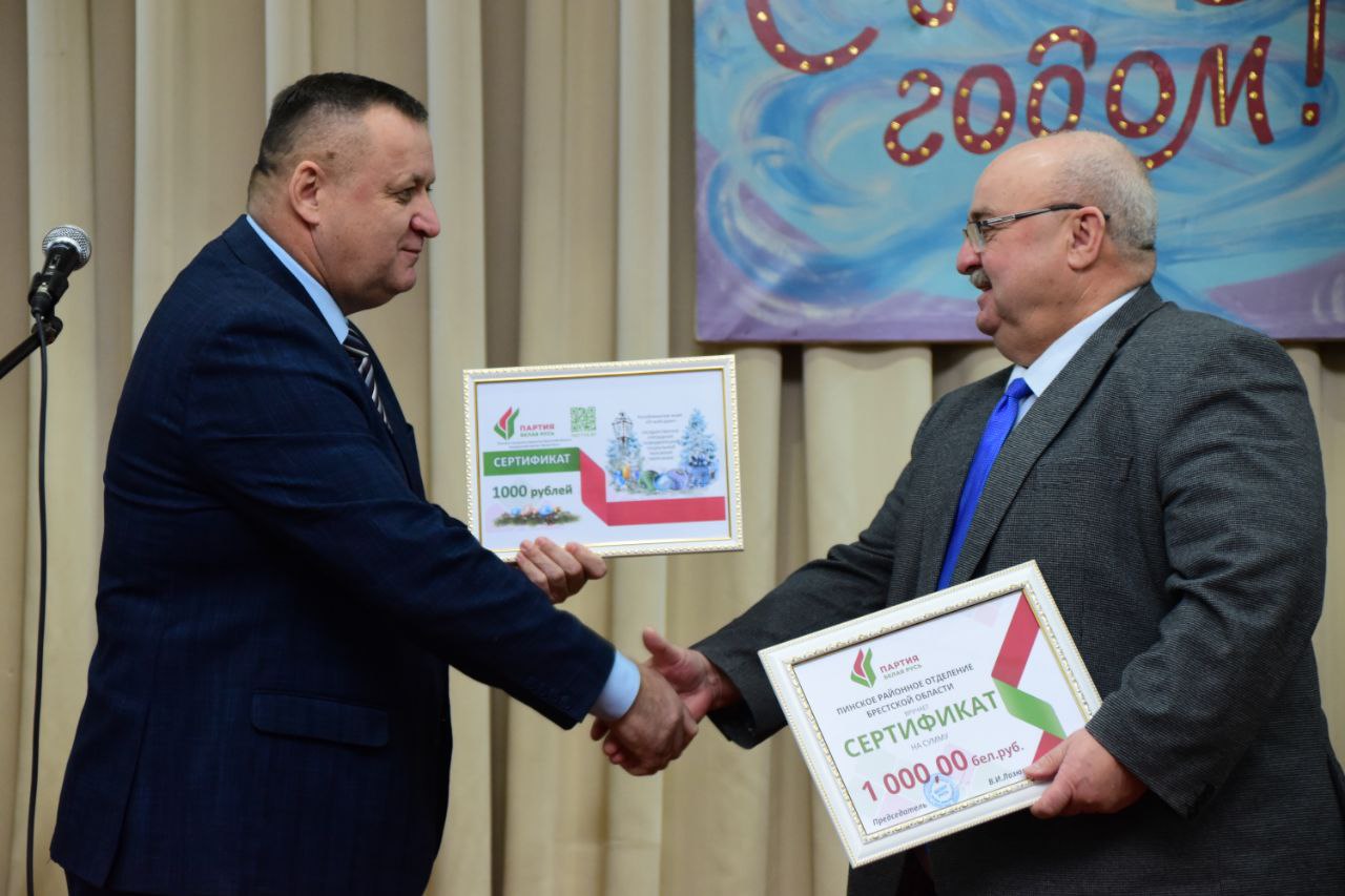 14 января председатель городского отделения партии Сергей Куницкий, а также заместитель главы районного отделения Дмитрий Полховский посетили Пинский социальный пансионат «Пина». Они поздравили постояльцев с зимними праздниками и передали руководству учреждения денежные сертификаты на укрепление материально-технической базы. К примеру, часть средств пойдет на устройство в пансионате дендропарка.