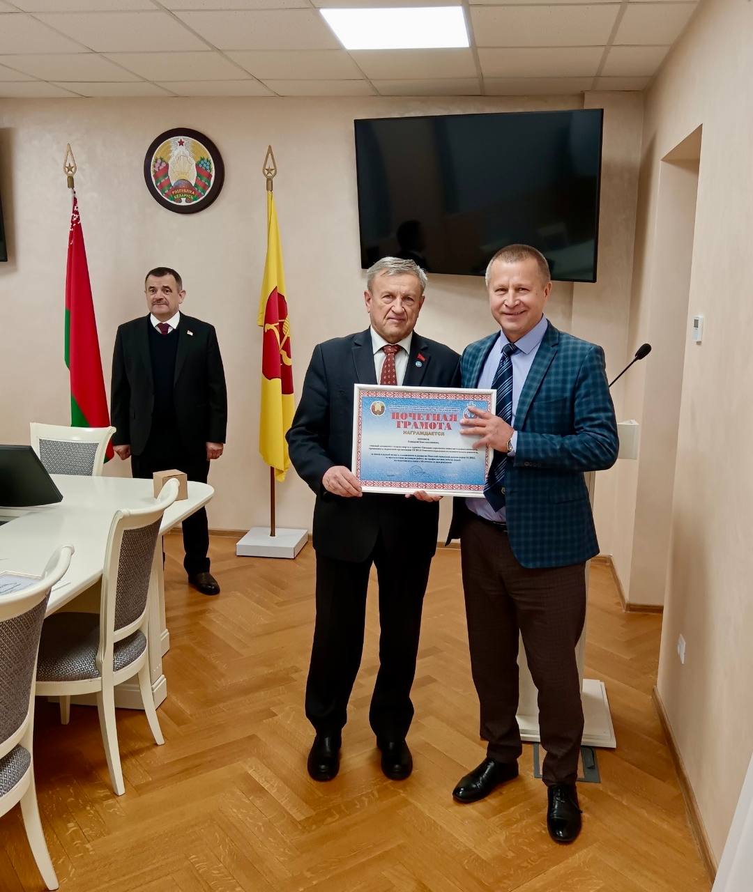 От имени республиканского совета Общества спасания на водах Юрий Пичугин вручил юбиляру Почетную грамоту за значительный вклад в становление и развитие первички, за многолетнюю активную работу по профилактике гибели людей на водоемах и в связи с 60-летием.