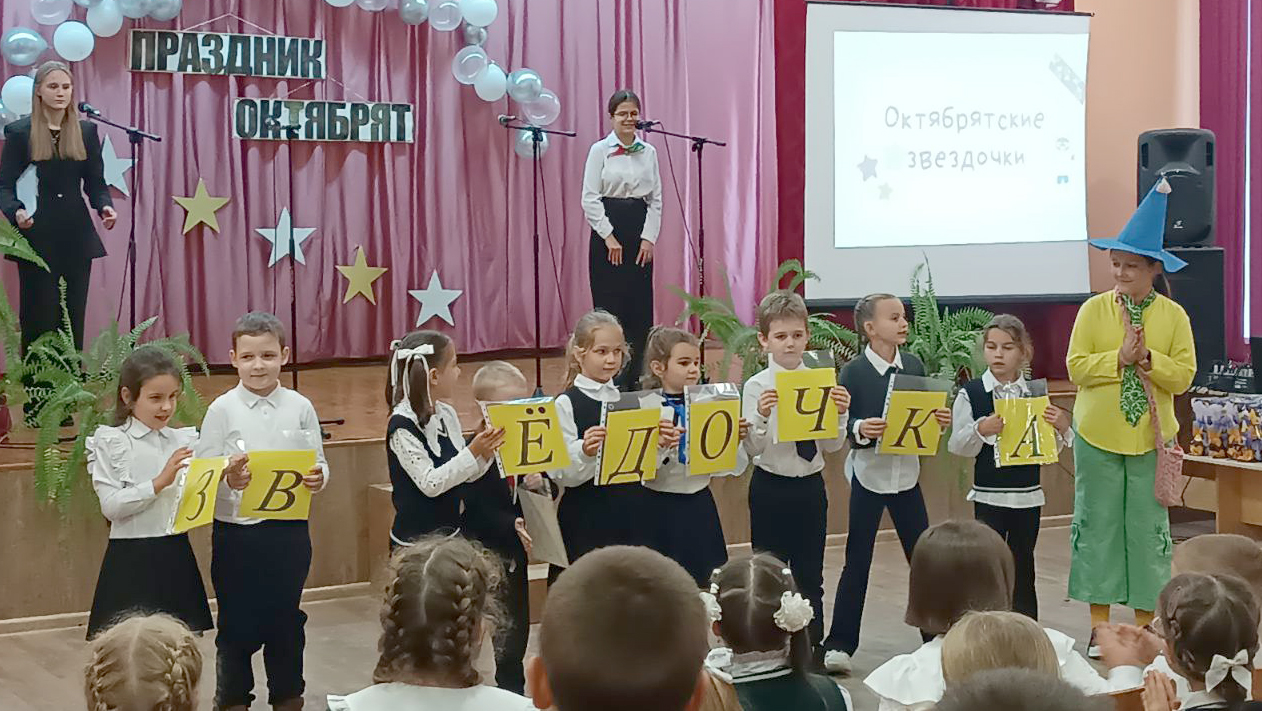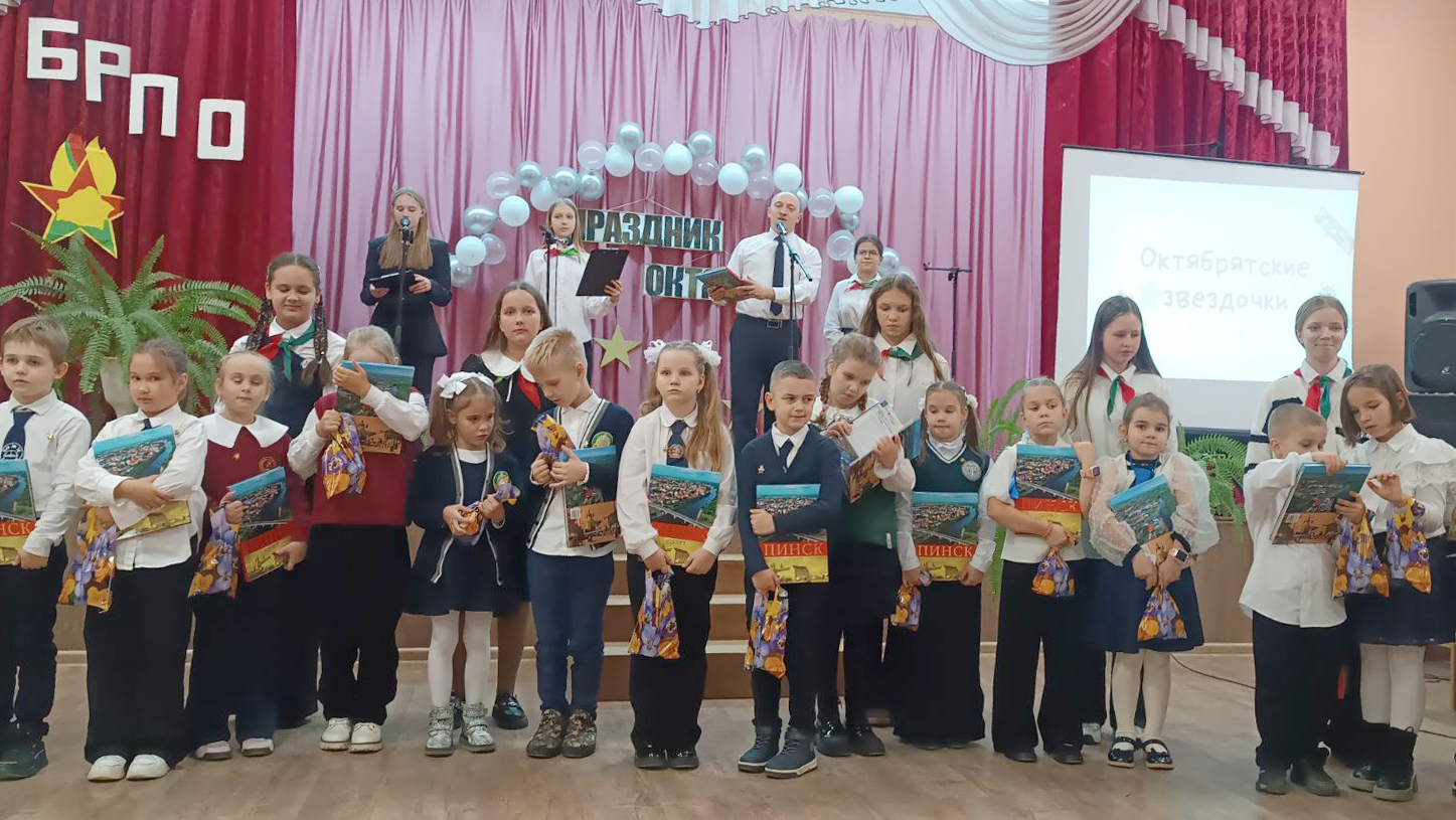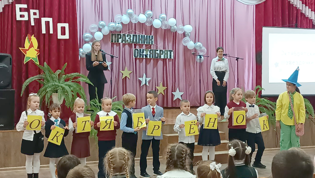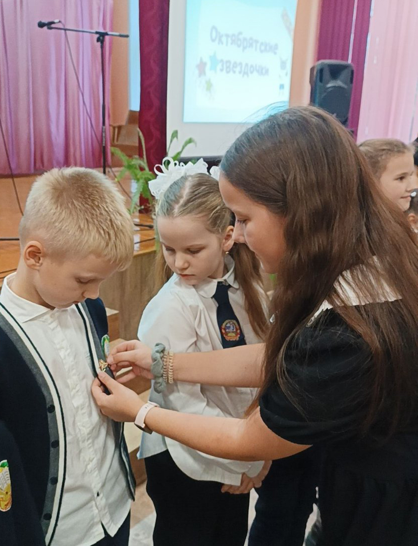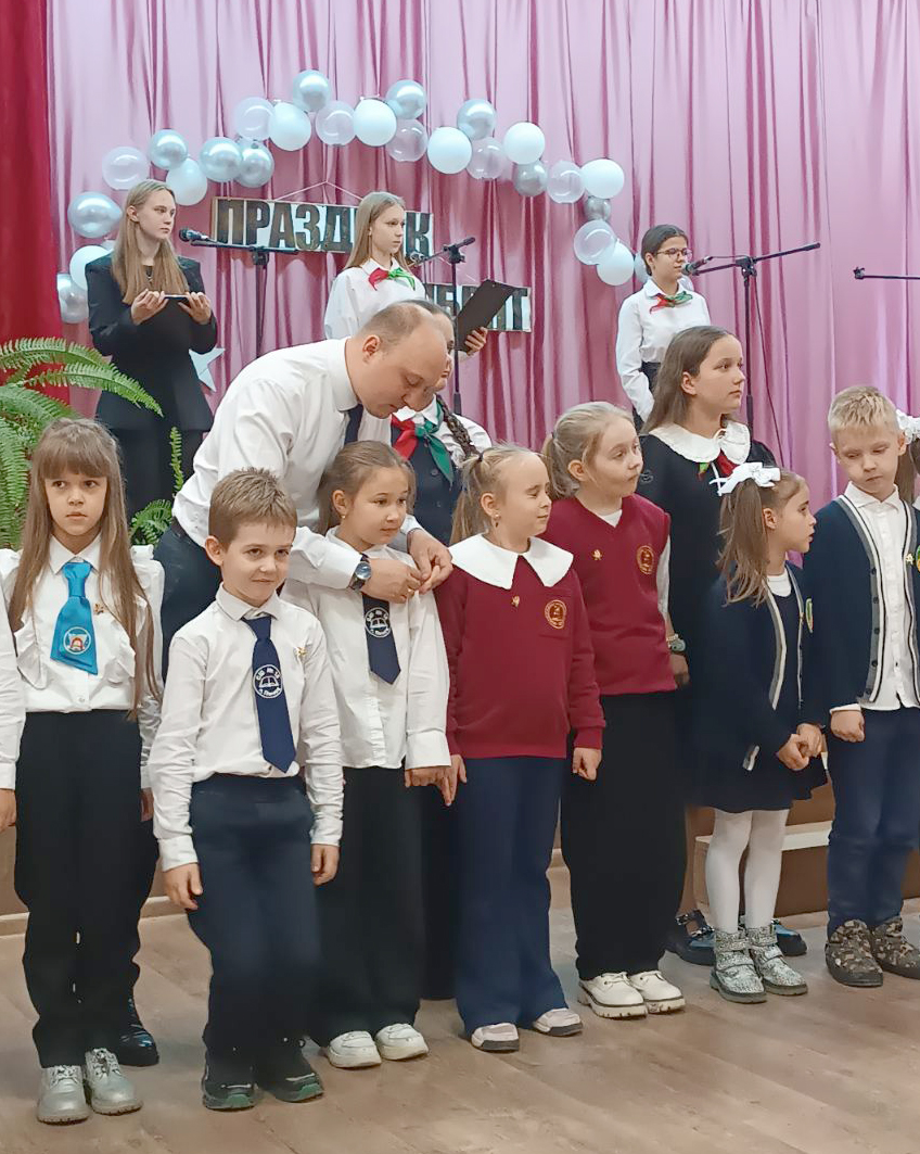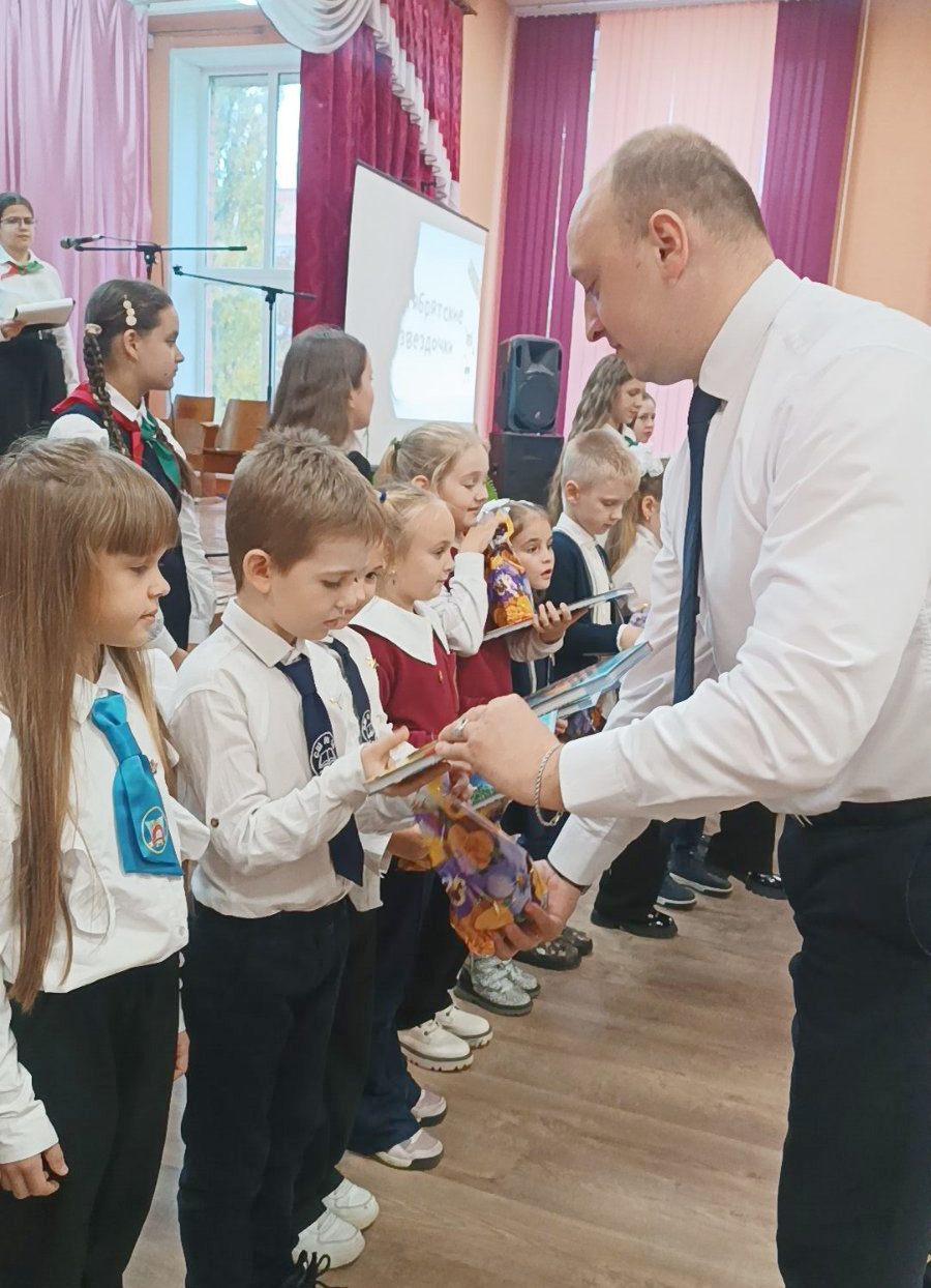 Новоиспеченных октябрят пришел поздравить начальник отдела идеологической работы и по делам молодежи горисполкома Кирилл Юрченко. Он также выполнил почетную миссию — прикрепил к рубашкам ребят значки и вручил подарки.