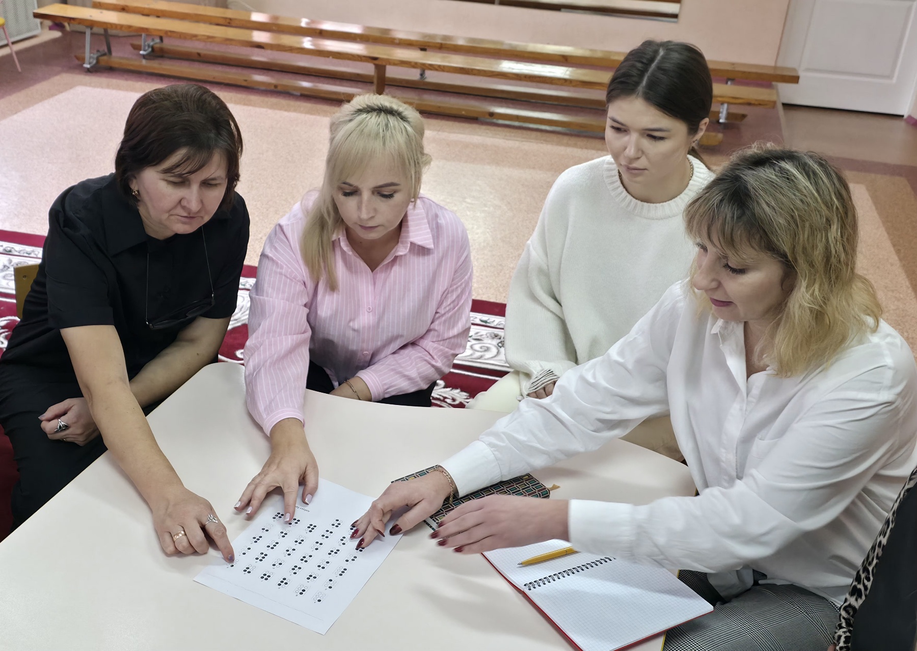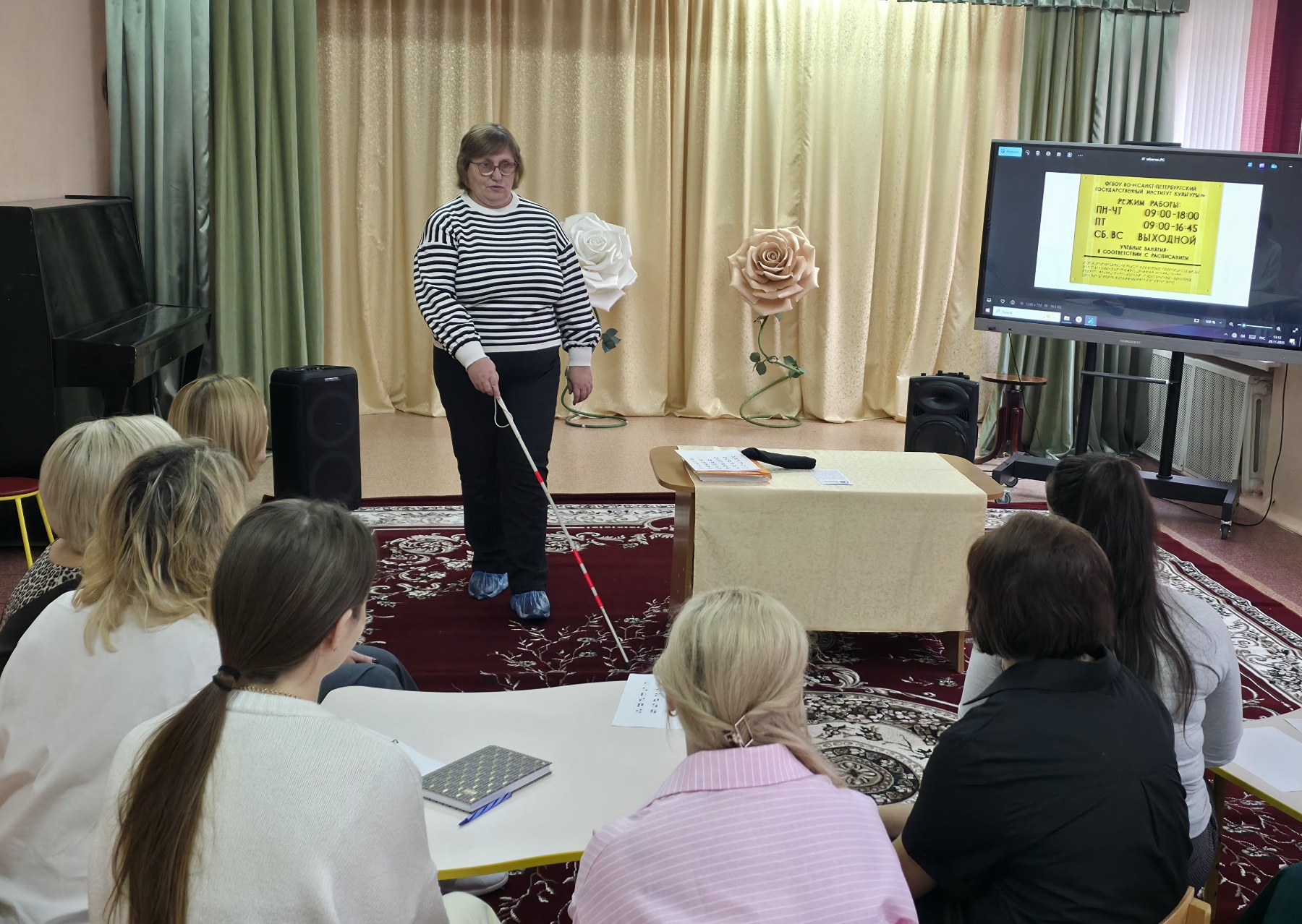 В завершение мероприятия Светлана Адамовна провела тренинг для педагогов по правилам сопровождения незрячих и слабовидящих людей. Практическая часть позволила участникам закрепить полученные знания и навыки, почувствовать, насколько важно быть внимательным и чутким в общении с людьми, имеющими особенности зрения.