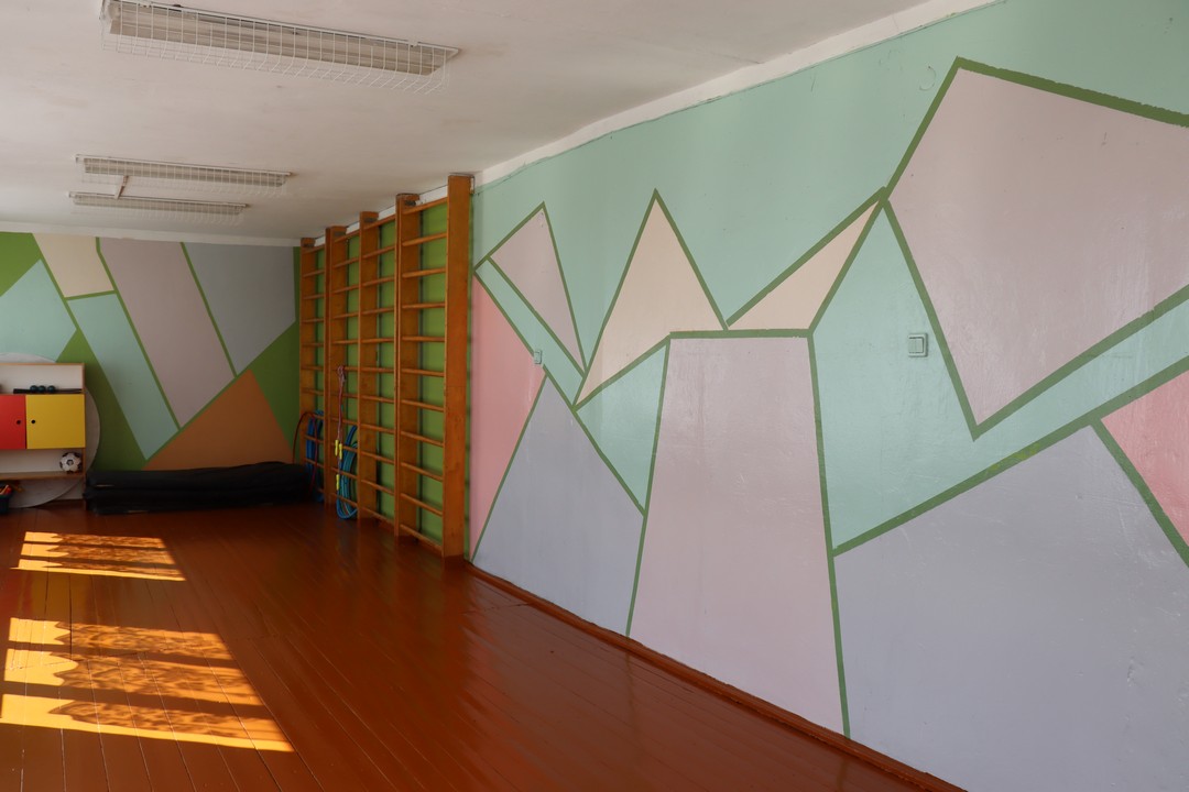 В этом году, по словам Татьяны Васильевны, был большой объем работ. Новые высококачественные обои, которые можно обрабатывать, поклеили в четырех кабинетах, везде покрасили полы и двери, а также спортивное оборудование на игровой площадке, полы и стены в игровом (он же актовый) зале.