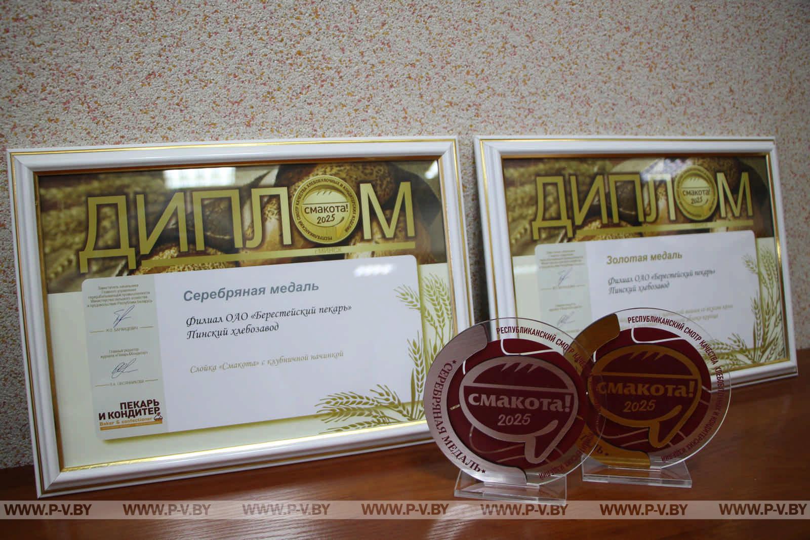Начальник центральной производственно-технологической лаборатории филиала ОАО «Берестейский пекарь» Пинский хлебозавод Зинаида Клименкова отметила, что предприятие завоевало целый ряд престижных наград, доказав, что продукция из Пинска не только отличается необыкновенным вкусом, но и соответствует высоким международным стандартам. На республиканском смотре качества хлебобулочных и кондитерских изделий «СМАКОТА-2025» их также ждал успех. Гран-При присуждено торту «Меренговый с шоколадным кремом», золотая медаль — слойкам «Смакота» с начинкой яблоко-корица и «Смакота» с начинкой вишня со вкусом колы, а серебряная – слойке «Смакота» с клубничной начинкой.