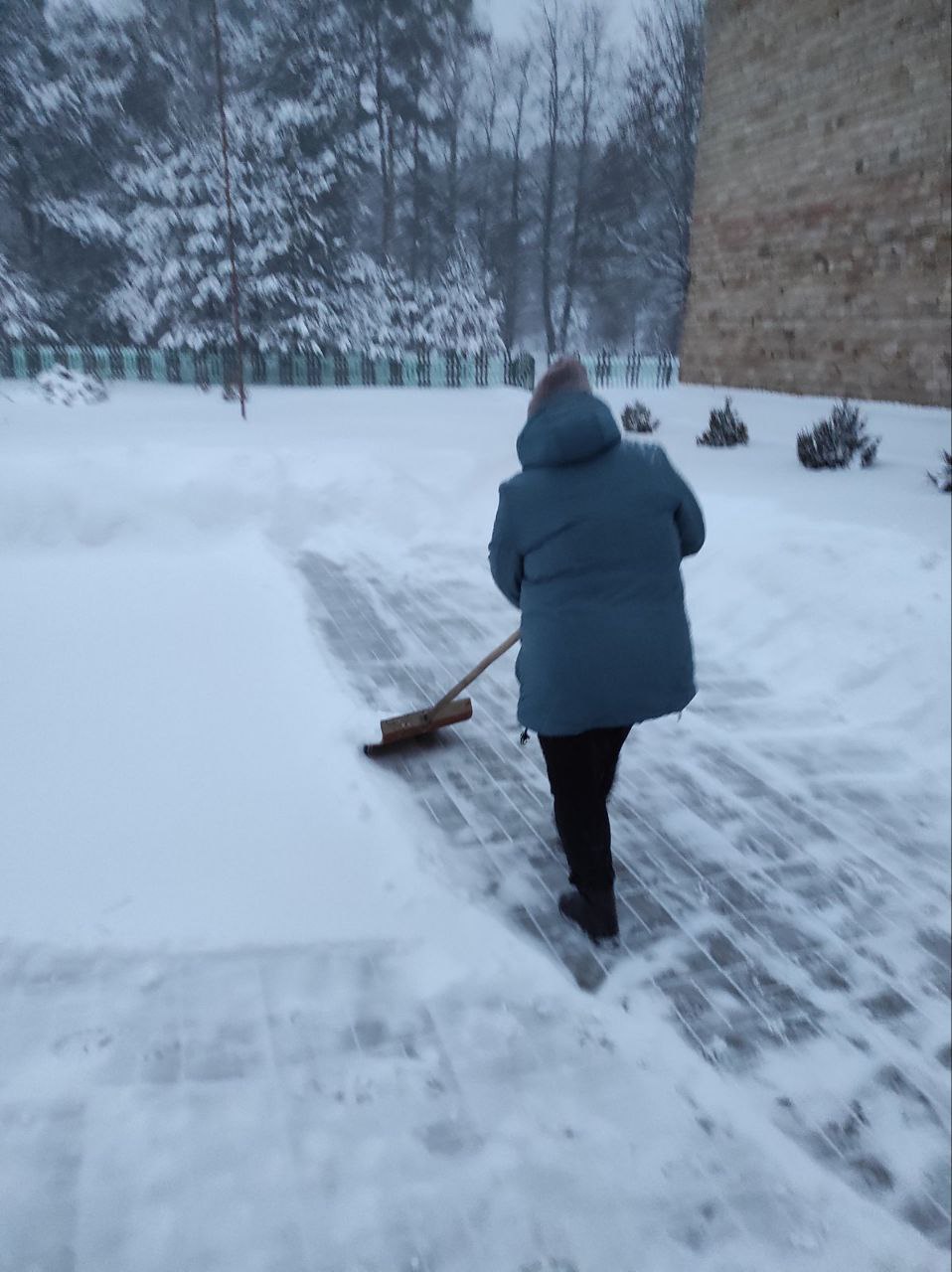 Утром школьные дворы ожили, когда все вместе начали расчистку подходов к школе и дорожек к спортивной площадке.