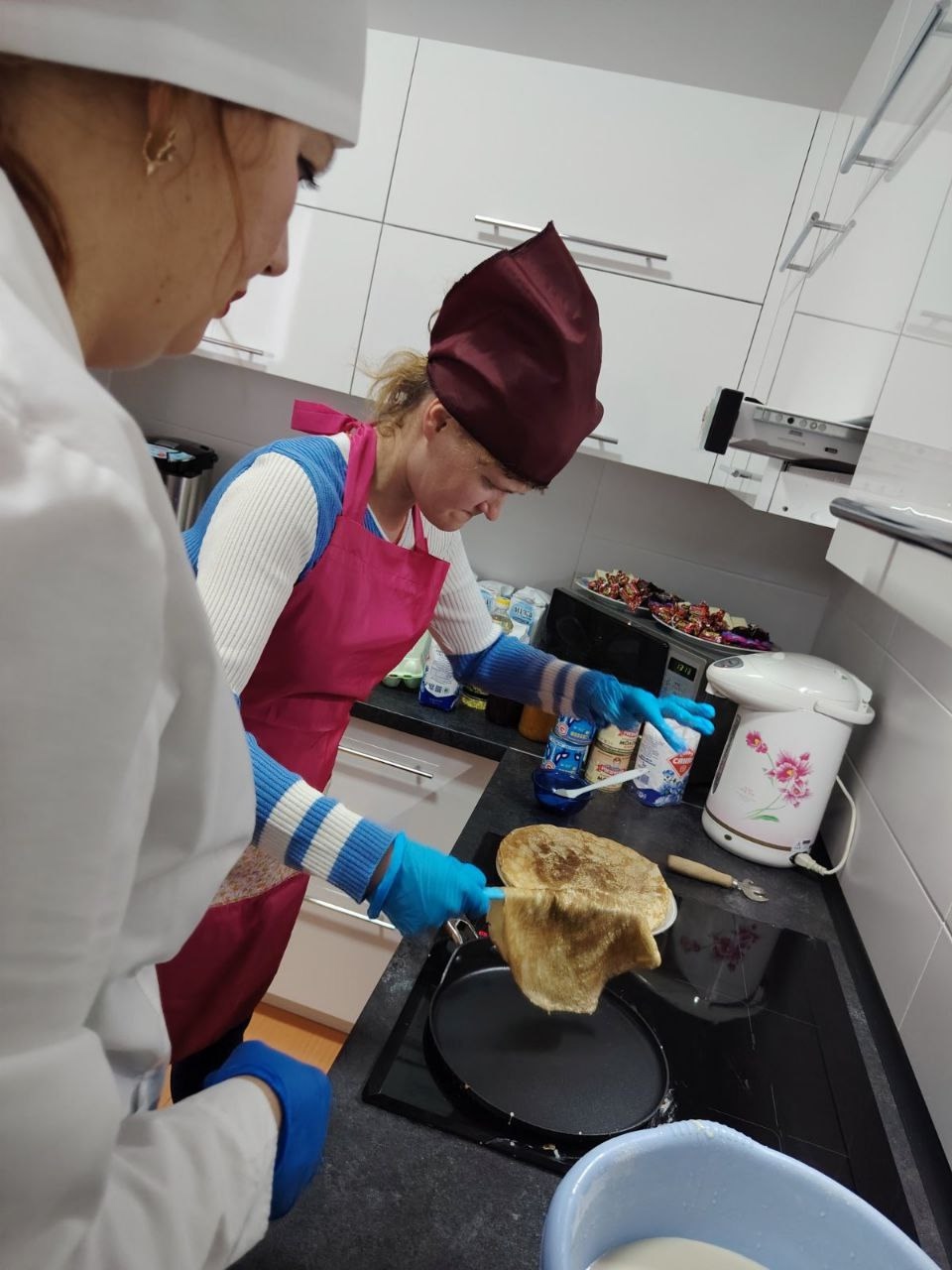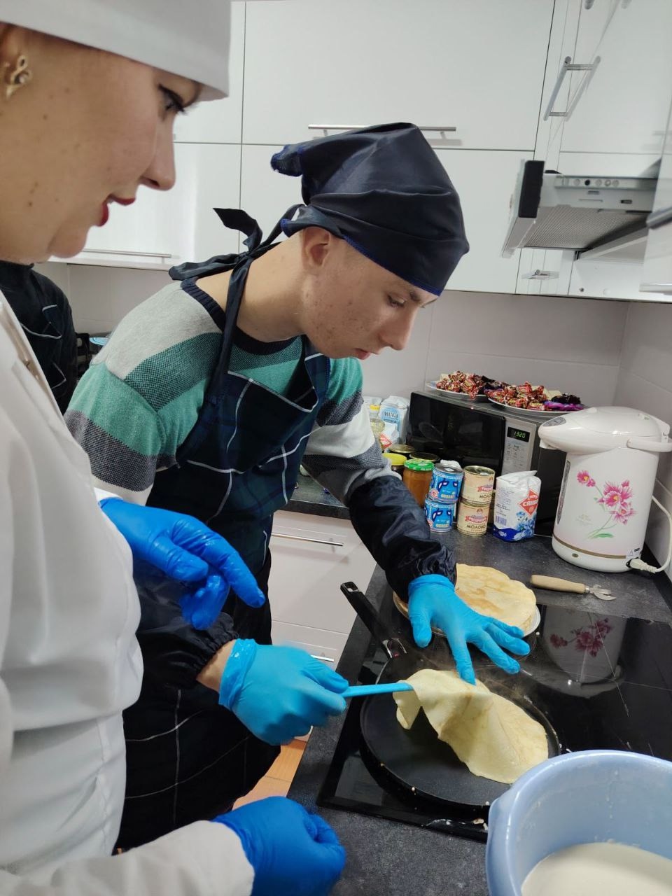 А потом волонтеры Пинского государственного аграрного колледжа провели кулинарный мастер-класс «Налистники» для подопечных отделения. Вместе с мамами и сотрудниками отделения ребята погрузились в атмосферу кулинарного творчества. Во время чаепития, организованного приходом Свято-Феодоровского собора, все много общались, а еще пробовали испеченные блинчики.