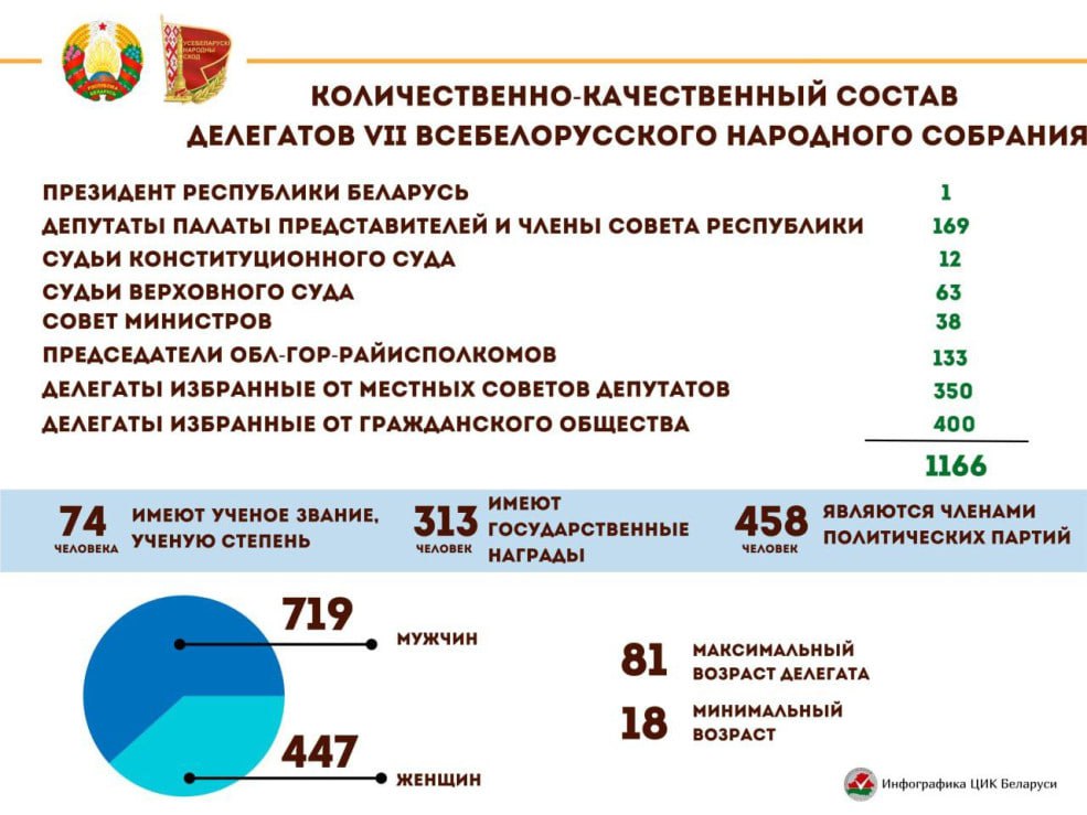 Цифры не лгут. Глядя на официальную инфографику ЦИК Беларуси , мы видим, что Всебелорусское народное собрание — это самый представительный, квалифицированный и опытный орган власти, сформированный по принципу консолидации всех сфер жизни!